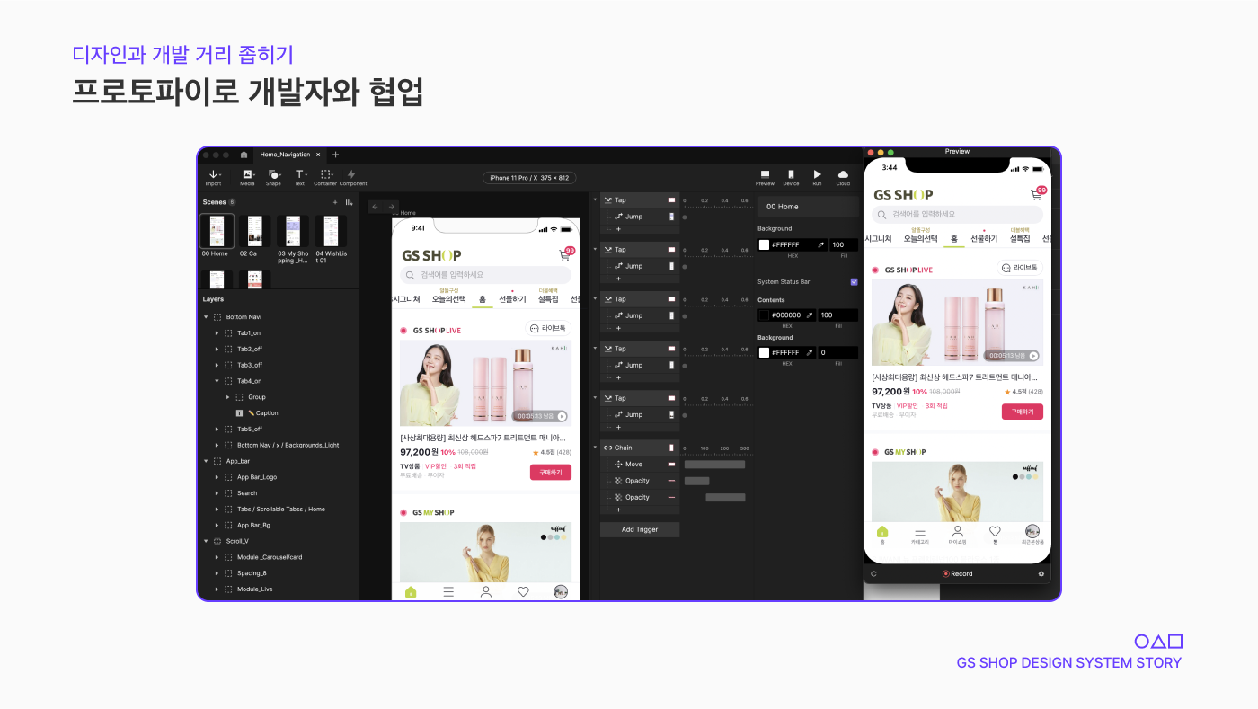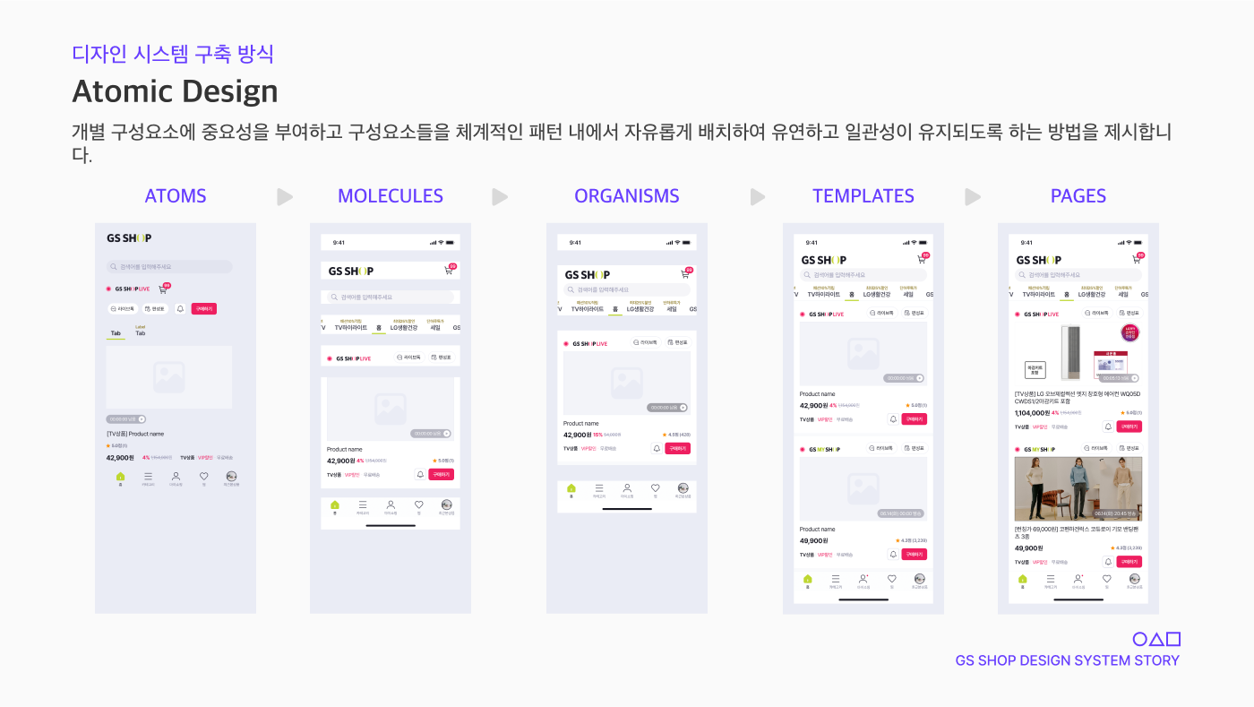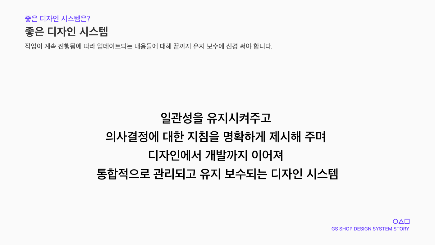 계속해서 GS SHOP App의 디자인 시스템을 업데이트하며 반복적이고 공통적으로 사용되는 요소에 대한 재작업을 없애고 작업에 최적화된 투명하고 명확한 디자인 시스템을 설계하는 것을 목표로 가지고 있습니다.