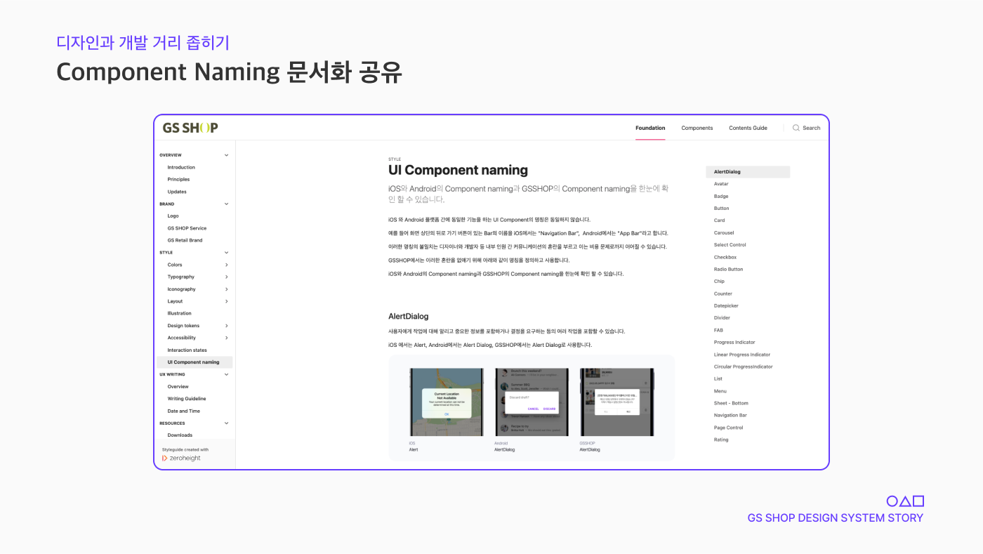 이러한 혼란을 없애기 위해 내부에서는 iOS와 Android의 Component naming과 GS SHOP의 Component naming을 통일시켜 한눈에 확인할 수 있는 문서를 작성하여 공유하고 있습니다.
