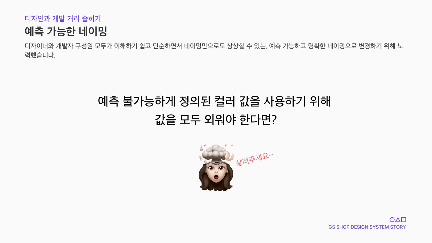 디자인 관점에서만 보았던 색상의 네이밍이나 각 색상마다 용도가 있지만 모든 작업자들이 그 용도에 대해 직관적으로 알기 어렵고 특정 역할에 국한된 네이밍과 제외해도 되는 요소들이 포함되어 네이밍이 길고 어렵게 느껴지기도 했습니다. 같은 색상이지만 네이밍이 다른 요소들도 있어 중복의 문제도 있었습니다.