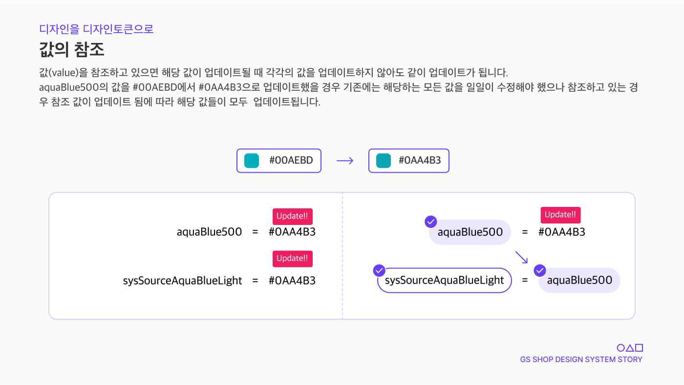 예를 들어, 기존에 aquaBlue500라는 값을 #00AEBD라고 사용하고, sysSourceAquaBlueLight라는 값으로 aquaBlue500을 참조하여 사용하고 있었다고 할 경우, 접근성 이슈 등으로 해당 값을 업데이트해야 하는 일이 생긴다고 가정했을 때 피그마 토큰에서 Aquablue500의 값만 #0AA4B3으로 업데이트해 주면 기존 aquaBlue500의 값을 참조하던 sysSourceAquaBlueLight의 값을 업데이트해 줄 필요 없이 참조한 값들이 한 번에 업데이트됩니다.