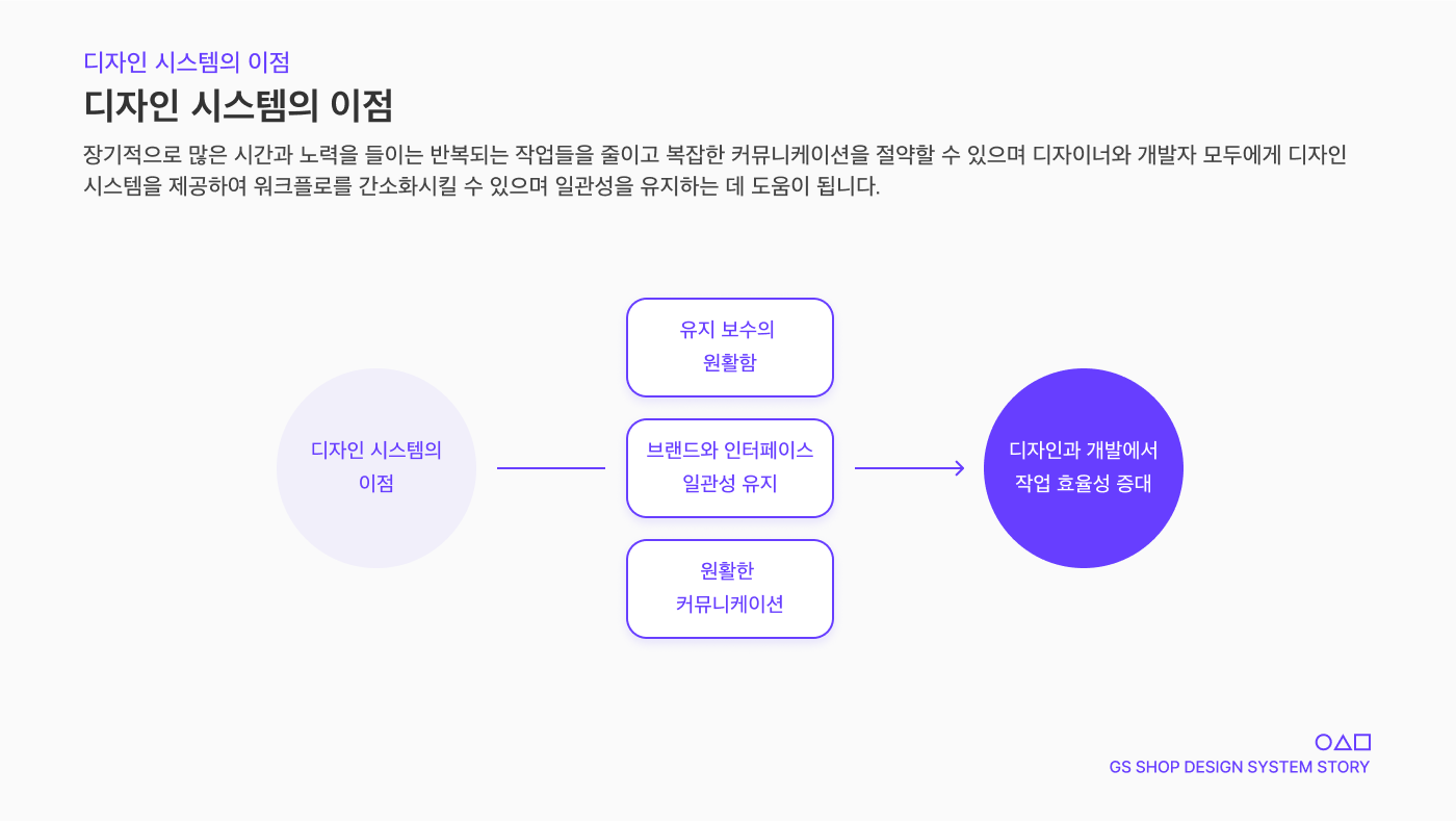 최종적으로 그리는 그림은 디자이너분들과 개발자분들 그리고 GS SHOP 관련자 모두가 이 디자인 시스템을 사용하여 업무를 효율적으로 진행하여 업무의 무게를 줄여드리고 고객에게 만족스러운 경험을 제공하여 GS SHOP App의 경쟁력을 높이는데 기여하고 싶은 바람입니다.