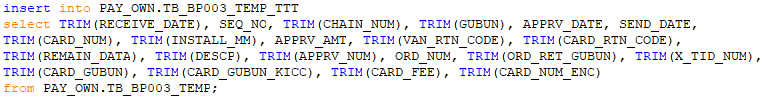 원래 사이즈와 동일한 TB_BP003_TEMP_TTT에 char, varchar2는 TRIM을 적용하고