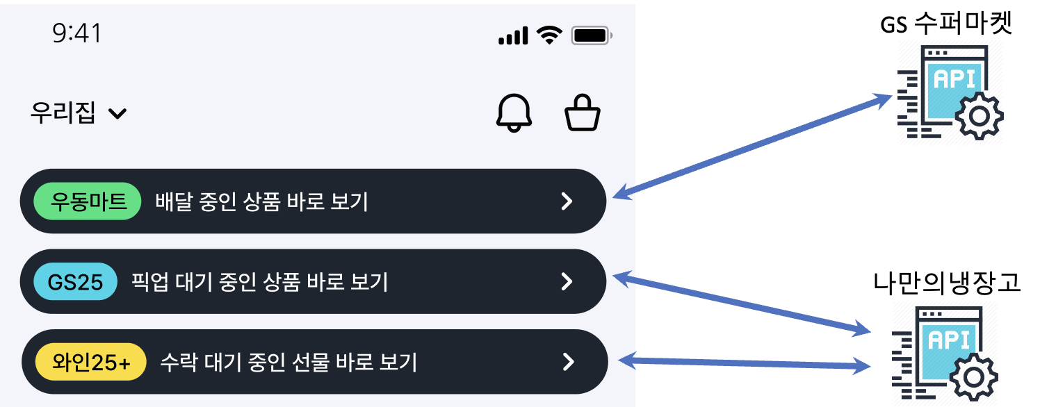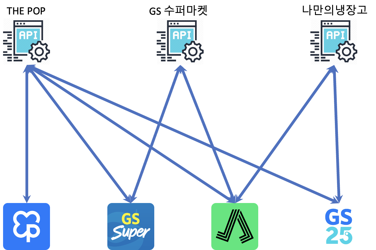 먼저 오픈한 3개의 앱(나만의 냉장고, GS 수퍼마켓, THE POP) 은 각자의 API 서버 를 두고, 필요한 정보를 요청하는 형태로 개발 되었습니다. 후에 오픈한 와인25플러스와 우리동네 딜리버리는 필요에 따라 기 구축된 API 서버에 기능을 추가하는 방식으로 개발이 진행되었습니다.