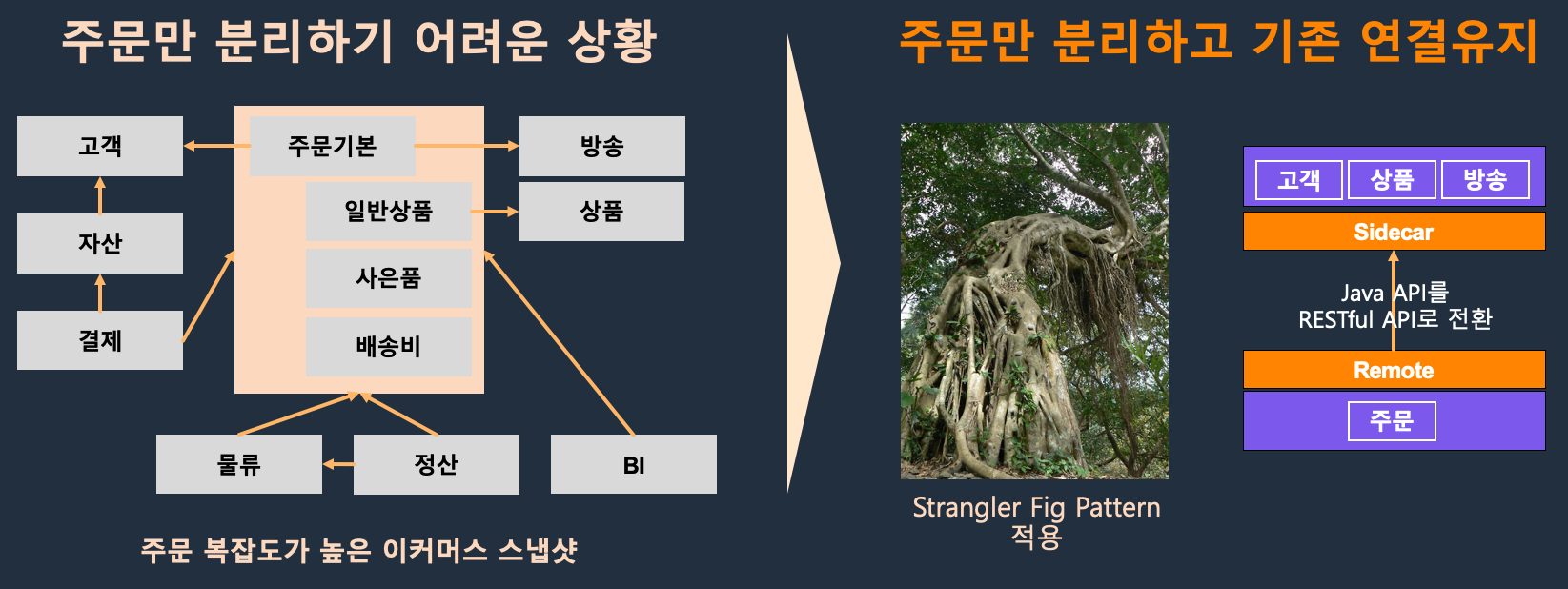 업무도메인간 기존 연결을 유지하면서, 주문만 분리하는 방법에 대해 고민 할 수 밖에 없었는데요. 이에 대한 해법으로 스트랭글러 패턴에서 영감을 얻었습니다.