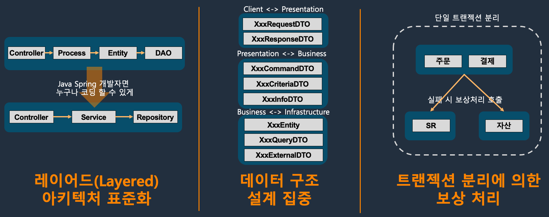 우선은 클라이언트 변경사항의 최소화에 중점을 두고, 그동안 습득한 비즈니스 노하우를 가지고 요청과 응답에 대한 데이터구조인 DTO를 정의하였고요. 비즈니스 레이어에서는, 상태변경과 조회 그리고 정보 성격의 DTO로 구분하였습니다. 인프라스트럭처 레이어에서는, DB에 대한 상태변경과 조회 그리고 API나 이벤트에 대한 DTO로 구분하여, 하나 잘 만들어 놓으면 다른 개발자들이 쉽게 가져다 활용하는, 선순환 구조로 개선하였습니다.