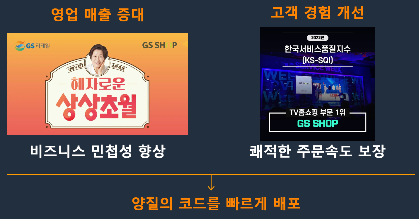성공적으로 미션을 완료하기 위해서는, 비지니스를 민첩하게 연결하거나, 서비스 성능 개선에 기여해야만 한다고 말씀드렸는데요. 이를 실행 할 수 있는 것이, 양질의 코드를 빠르게 배포하여 서비스에 반영하는 것입니다.