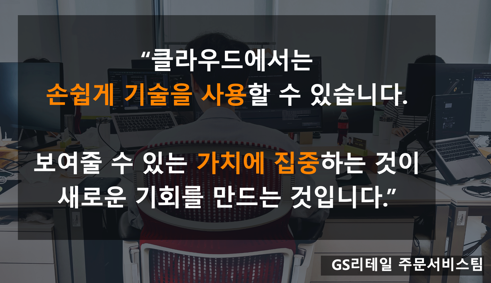 클라우드에서는 손쉽게 기술을 사용할 수 있습니다. 보여줄 수 있는 가치에 집중하는 것이, 새로운 기회를 만드는 것입니다. 라고 함께 일하는 주문서비스팀 멤버들의 메세지를 여러분께 전달 해 드립니다. 멤버분들의 일하는 모습도 담아봤습니다.