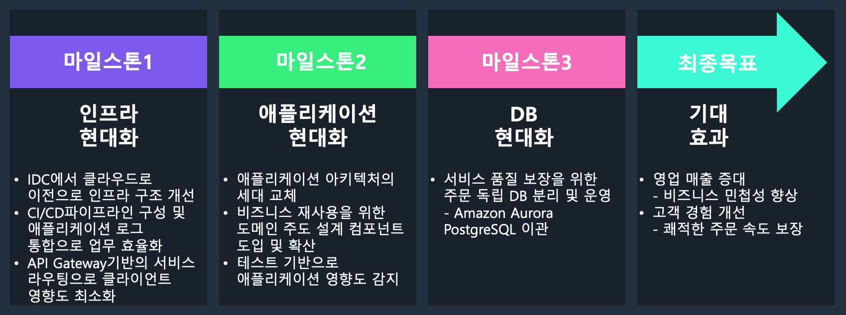 위의 3가지 마일스톤이 완료되면, 애플리케이션 현대화에 대한 최종목표에 도달하게 되고요. 주문서비스팀 미션인 영업매출 증대와 고객 경험 개선에 기여하게 될 것입니다.