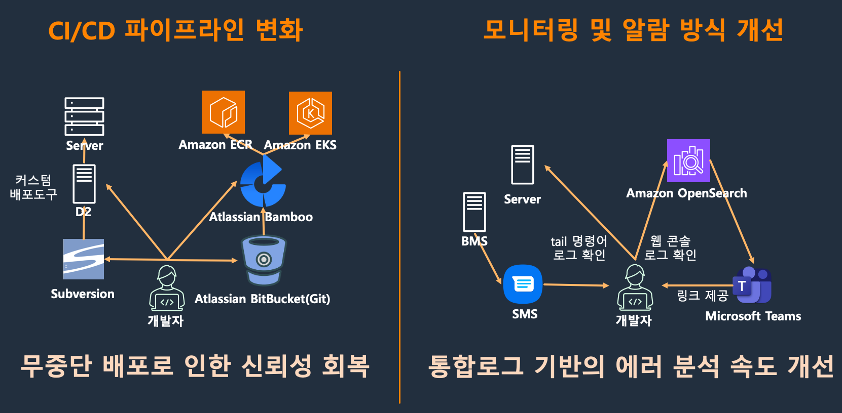 아마존 EKS를 도입하면서, 컨테이너 이미지 기반의 롤링 업그레이드로 배포방식을 전환하였고, 배포 시 문제가 발생하면, 배포가 되지 않거나 이전 이미지로 바로 롤백 할 수 있어서, 업무의 효율성을 얻게 되었습니다. 그래서 기존에는 수시배포가 가능함에도, 매주 목요일에 모아서 정기배포를 진행하였는데요. 지금은 배포에 대한 두려움이 사라져, 수시배포도 별도로 진행하고 있고요. 배포의 자유로움도 만끽하고 있습니다.