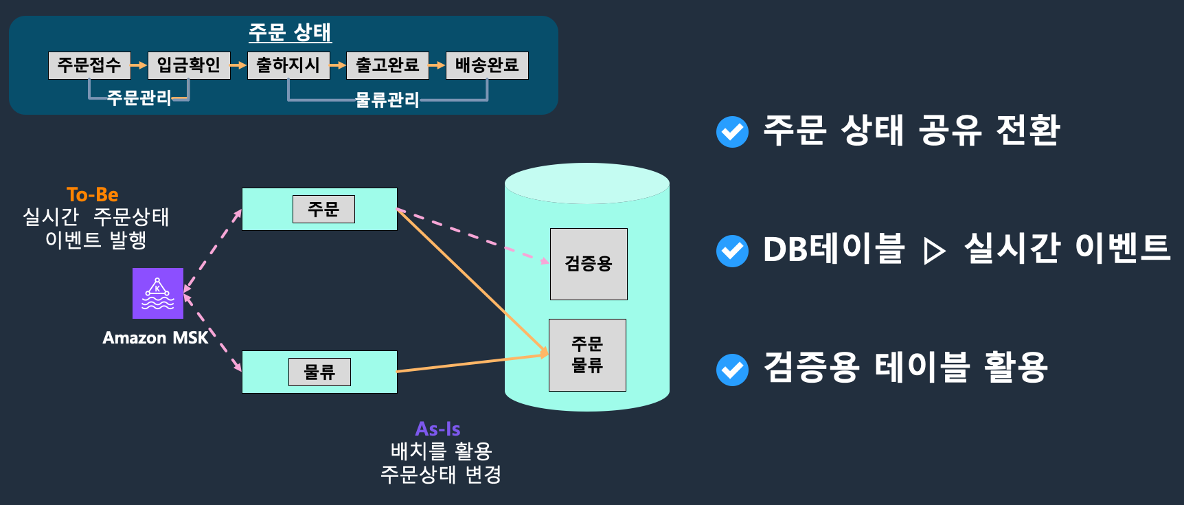 주문과 물류는 DB테이블을 함께 사용하고, 각각 배치 처리로 주문상태를 함께 업데이트하여, 서로 강한 의존성을 가지고 있는데요. 향후 주문서비스 품질을 보장하기 위해서,는 주문DB 분리가 필수인데, 물류와의 강한 의존성이 있기 때문에, 이 부분을 제거하지 않으면, 향후 주문DB 분리에 커다란 걸림돌이 되는 상황이라, 꼭 해야만 되는 것이었습니다.