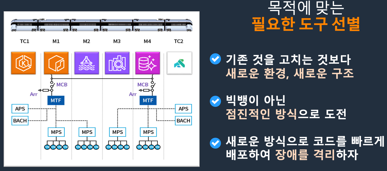 점진적인 방식으로 하기 위해, 애플리케이션 현대화에 대한 사례 검토와 검증을 하였고, 교체해야 되는 필요한 부품들의 용도를, 잘 파악하여 선별하였습니다. 예를 들어 아마존 EKS나 MSK 오픈서치 오로라DB 등이 있는데요. 클라우드 환경이기에, 직접 만들거나 설치하기 보다는, 서비스 기능을 이해하고 손쉽게 활용하는 것으로 원칙을 세웠습니다.