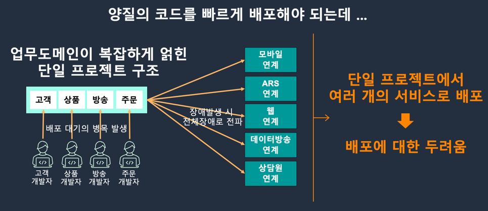 첫번째 페인 포인트는, 고객 상품 방송 주문의 업무도메인이, 하나의 프로젝트에 복잡하게 얽혀 있는 상황인데요. 각 업무도메인의 개발자들이, 코드의 의존성이나 영향도 때문에, 배포순서에 줄을 서야 하는, 비효율적인 부분이 발생하고 있었습니다. 이러한 병목으로 인해, 코드 배포는 더 이상 빨라 질 수 없었는데요.