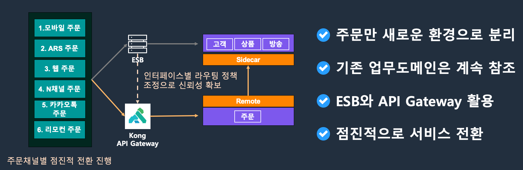기존에 주문채널의 요청을 받아주는, ESB에서 새로운 API Gateway로, 기존 인터페이스 방식을 변경하여 전환하는 것이라, 주문채널 쪽 변경사항은, 필수적으로 발생하게 되었고요. 전환 시에는 장애 없이 주문을, 무중단으로 계속 받아야 하기 때문에, 주문채널의 유관부서에서는 부담감이 있었고요. 주문서비스를 제공하는 입장에서, 이를 최소화 하려고 고민했습니다.