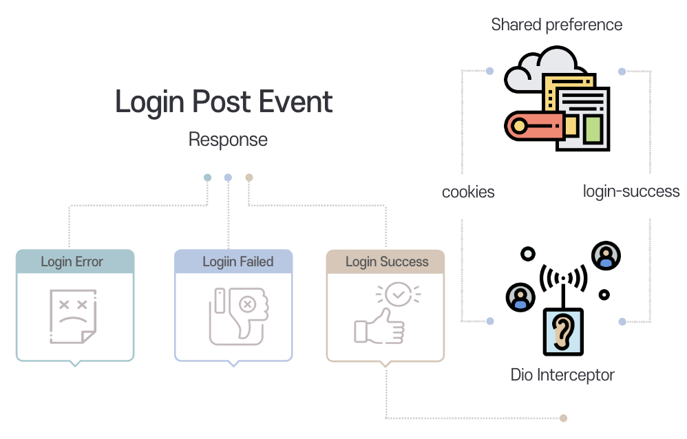 다음은 GS SHOP 로그인 화면 개발입니다. 사용자가 로그인 버튼을 누르면 로그인 Post 이벤트가 발생되어 사용자가 입력한 값을 토대로 필요한 정보를 담아 Post 요청을 보냅니다. 여기서 로그인이 성공하면 LoginSuccess 상태로 전환되는데 Dio 인터셉터에서 로그인 response의 헤더에서 쿠키를 가져와 SharedPreference에서 세팅해줍니다.
