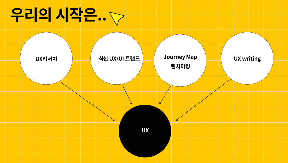 - 저희의 시작은 소모임 주제들 중 UX리서치 / 최신 UXUI트렌드 / 유저 저니맵 벤치마킹 / UX라이팅 분야에