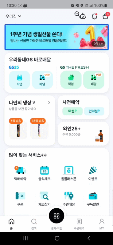 우리동네GS 홈 화면 상하단에는 배너 영역이 있으며, 일정 주기마다 다음 배너로 넘어가도록 자동재생됩니다.