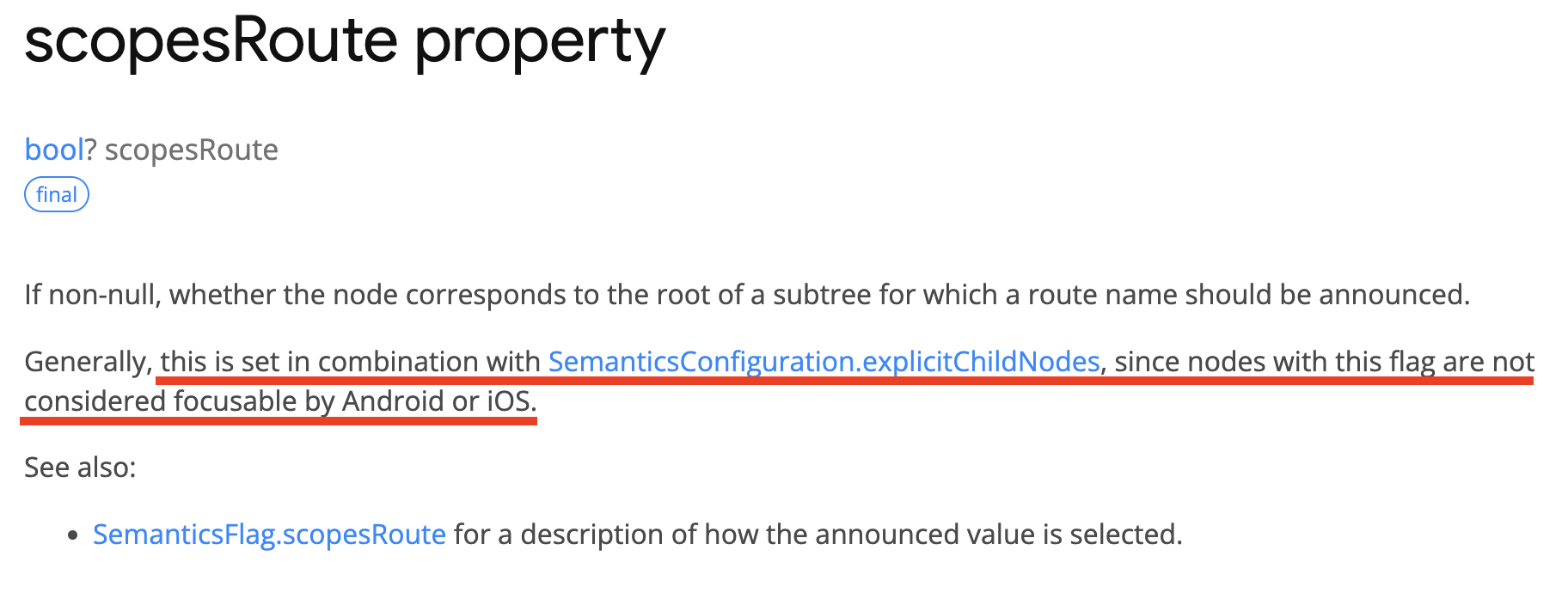 bool? scopesRoute final If non-null, whether the node corresponds to the root of a subtree for which a route name should be announced. Generally, this is set in combination with SemanticsConfiguration.explicitChildNodes, since nodes with this flag are not