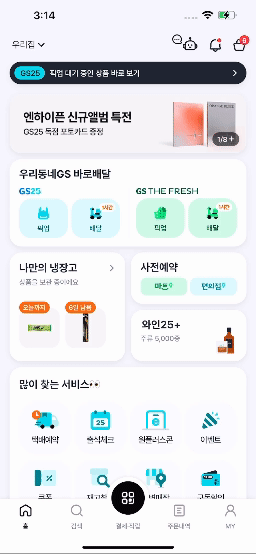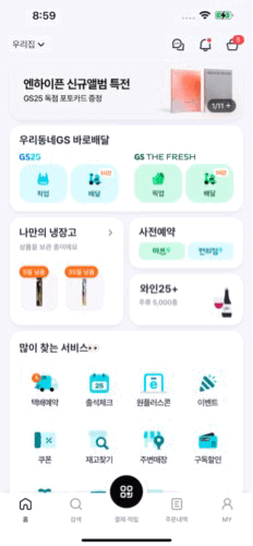 우리동네GS 는 바로배달과 같은 온라인 서비스뿐만 아니라 GS25, GS THE FRESH 에서 QR 결제, 나만의 냉장고 보관/꺼내먹기와 같은 오프라인 서비스도 지원하고 있습니다.