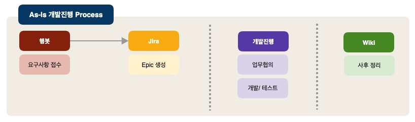 행봇이라는 챗봇을 통해 요구사항이 접수되면 자동으로 Jira Ticket이 생성되고 개발자는 요건을 분석하고 요청자, 기획자와 같이 협의 과정을 거쳐 확정된 feature를 개발합니다. 개발 중에 혹은 개발이 완료된 후에 Wiki에 요구사항, 개발요건, 테스트 결과 등을 정리합니다.