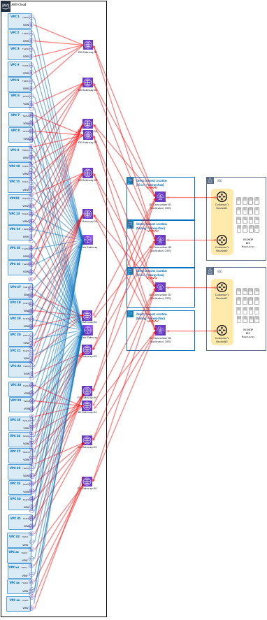 여기서 하남 IDC로의 DX를 추가 구성하게 된다면 VGW 라인이 기존의 2배 되어, 아래 그림과 같이 라우팅 복잡도 또한 2배 이상으로 증가 할 것으로 예상되었습니다.