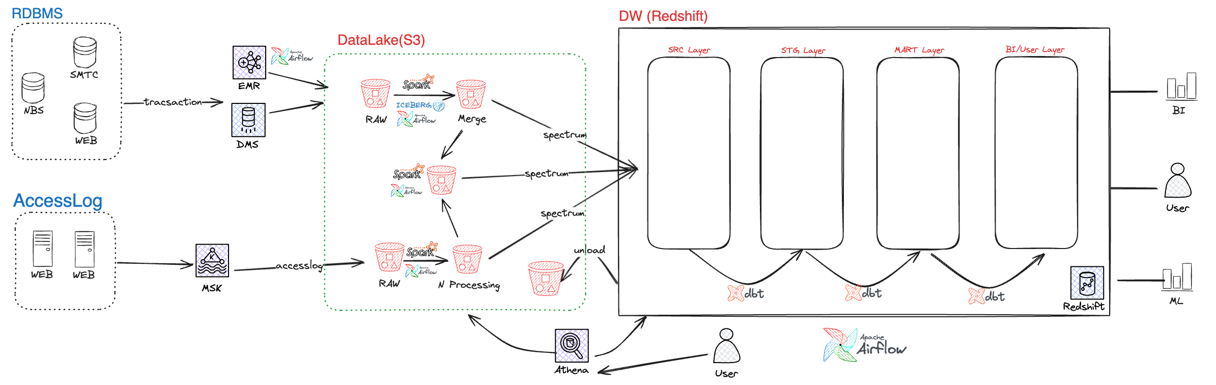 물론 스케일업으로 잠시나마 숨통을 틔울 수도 있지만, 근본적인 해결을 위해 클라우드환경으로 현대화하기로 했어요. 하지만 단순히 클라우드로 옮긴다고 문제가 해결되지는 않아요. 그래서 DW의 고통을 분담해 줄 데이터레이크(Data Lake) 구축, DBT(DB Build Tool)를 활용한 리니지가 보이는 코디 기반 DW 설계, 그리고 생성형 AI 기반 비즈니스 인텔리전스 도입 등을 클라우드 서비스와 연계해서 대대적인 변화를 계획하고 있어요.